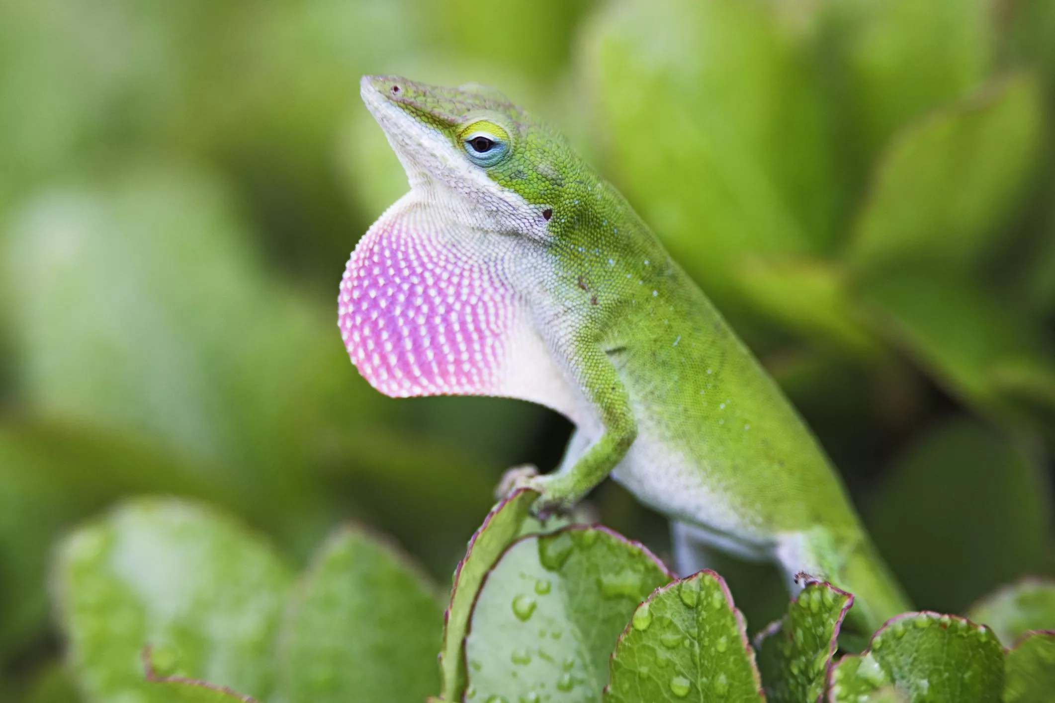 These lizards are sometimes called American chameleons, although they are not true chameleons at all. Anoles can change their color from brown to bright emerald green, and they are attractive little lizards. Males have a pink or red dewlap (the fold of skin under the chin/neck), which they flash during territorial and courtship displays. Females of some species also have dewlaps, although they are generally smaller and not displayed as often.