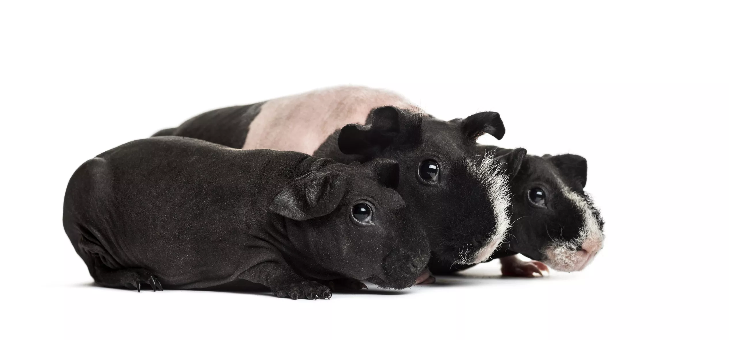 Skinny pigs are born without much hair and stay that way, but they have different skin pigmentations. They have a variety of color patterns, including Dutch, tortoiseshell, and Himalayan.
