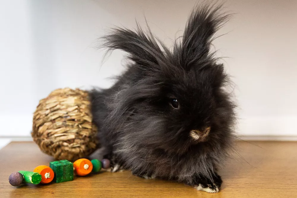 ![Black pet rabbit in front of bowl of rabbit pellets, pile of hay, and toys]